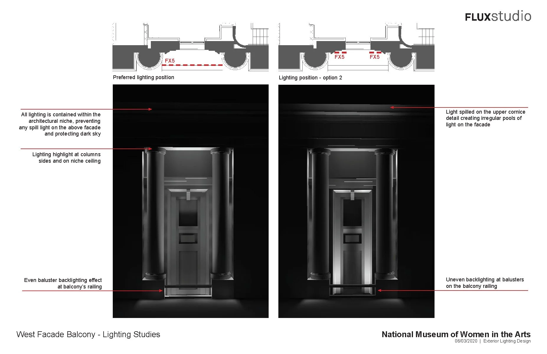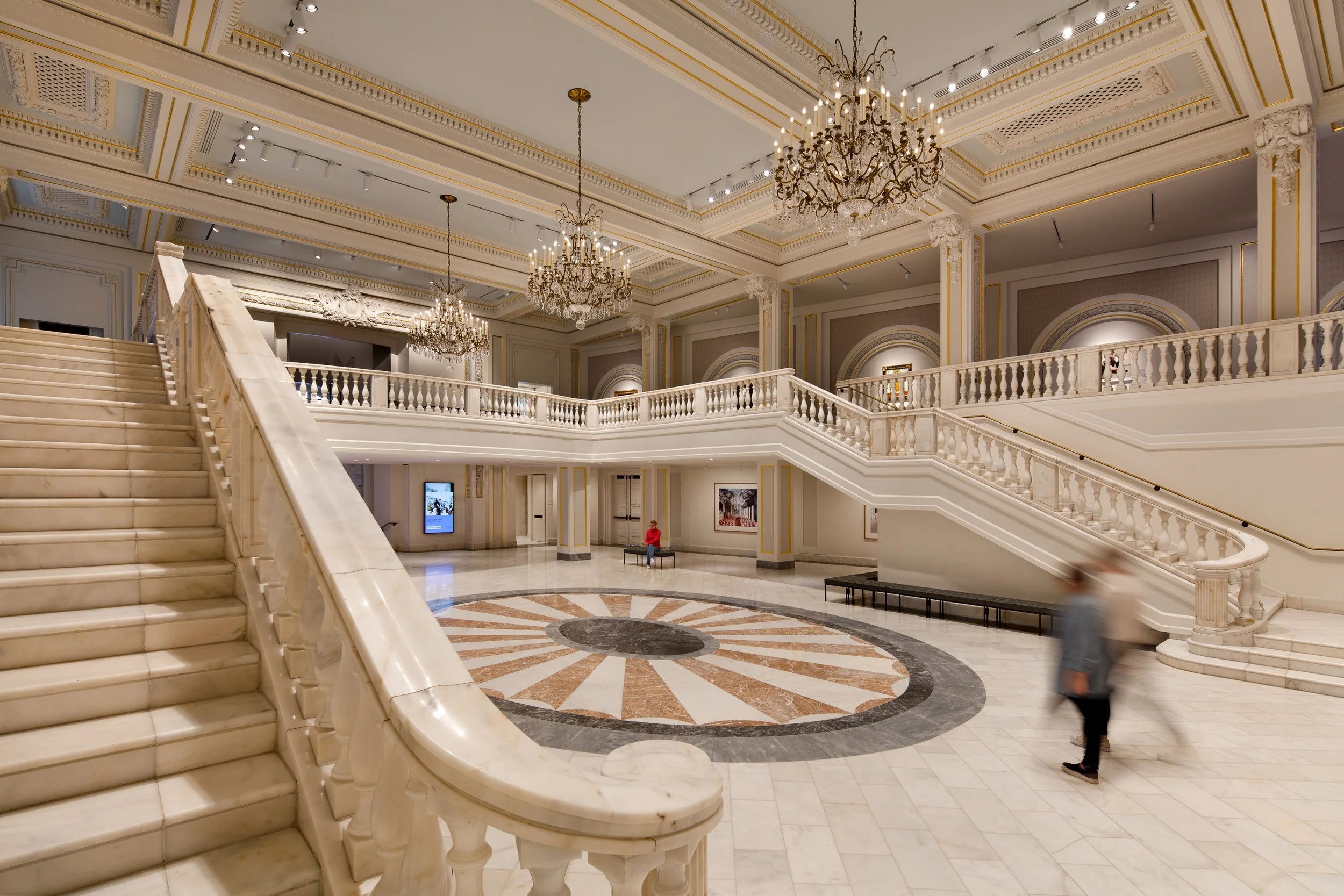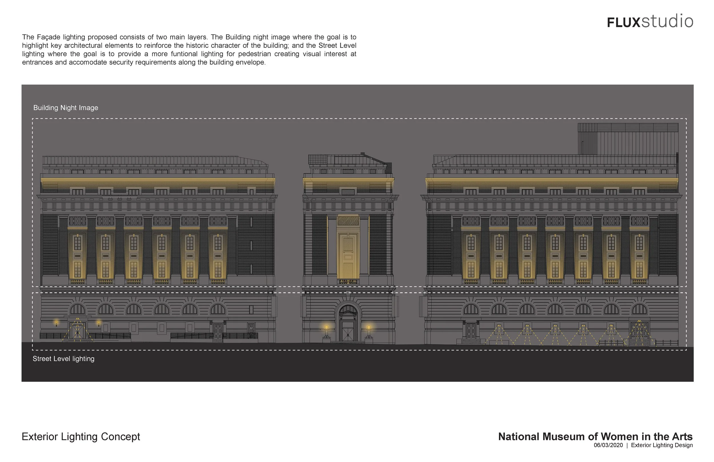 Originally built as a Masonic temple in 1908, this historic museum showcases work by women artists and hosts a range of public and private events. Our lighting design approach integrates lighting equipment with the building’s historic fabric, provides flexible lighting in the galleries, and reestablishes the building’s night identity. To address cost concerns without compromising design integrity, we developed a tiered lighting approach for the façade lighting that allowed for modifications based on changes to the project budget. We closely studied our lighting strategy for the Great Hall, integrating fixtures with the historic ceiling to highlight the balustrade while also providing ambient light to support circulation and events.