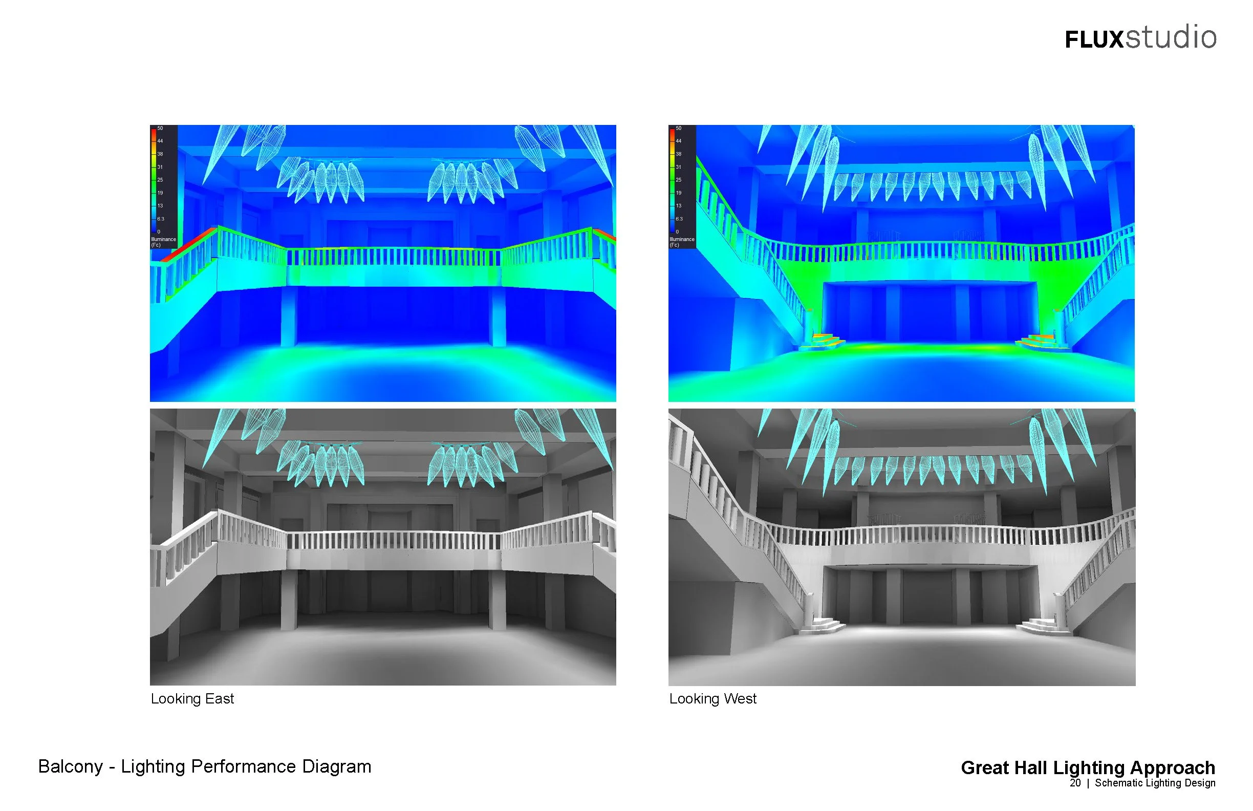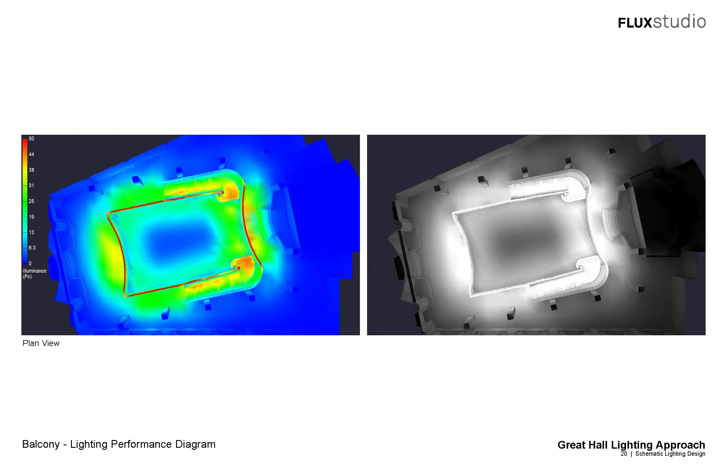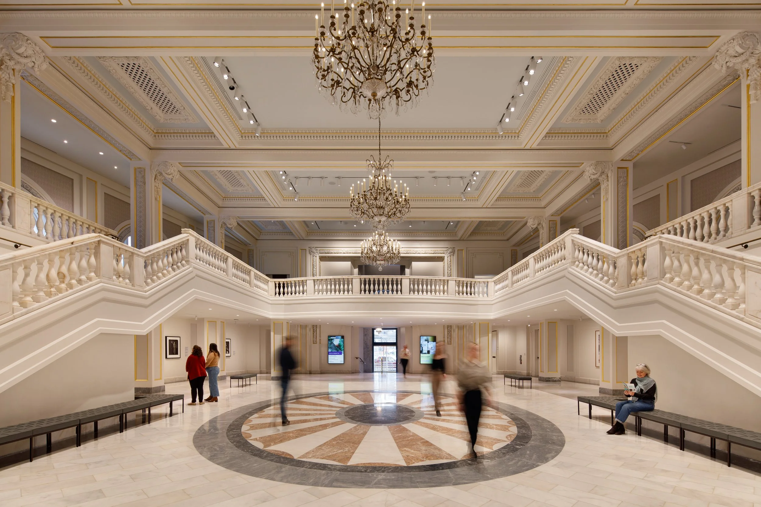 Originally built as a Masonic temple in 1908, this historic museum showcases work by women artists and hosts a range of public and private events. Our lighting design approach integrates lighting equipment with the building’s historic fabric, provides flexible lighting in the galleries, and reestablishes the building’s night identity. To address cost concerns without compromising design integrity, we developed a tiered lighting approach for the façade lighting that allowed for modifications based on changes to the project budget. We closely studied our lighting strategy for the Great Hall, integrating fixtures with the historic ceiling to highlight the balustrade while also providing ambient light to support circulation and events.